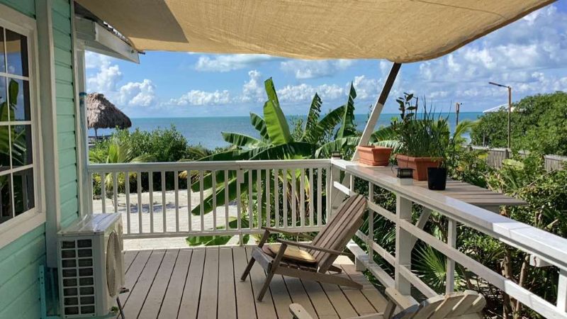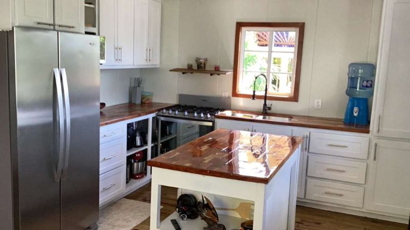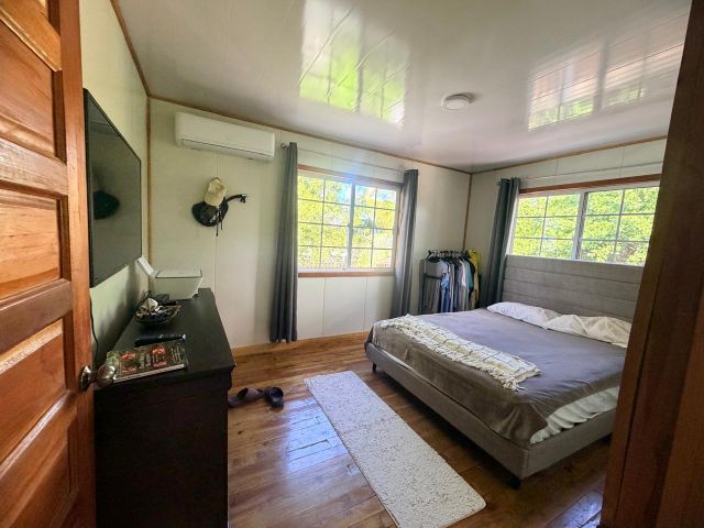 Beautifully furnished and thoughtfully designed, the home features an inviting open-plan layout and a cozy front veranda perfect for morning coffee or sunset views. White hardwood kitchen cabinets and gleaming varnished wooden countertops create a fresh, bright feel, while Belizean hardwood floors add warm island character throughout.