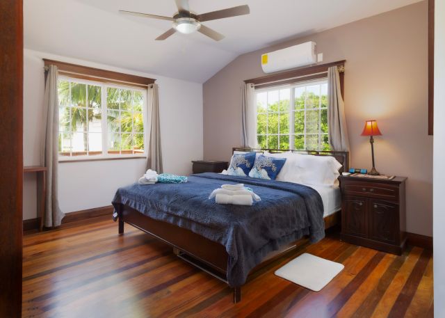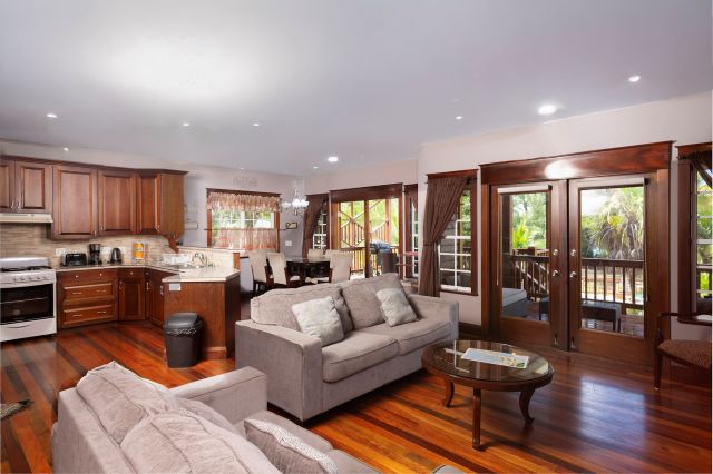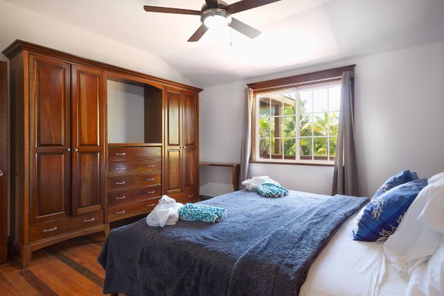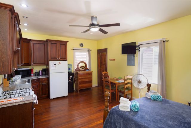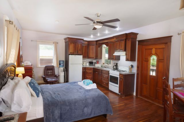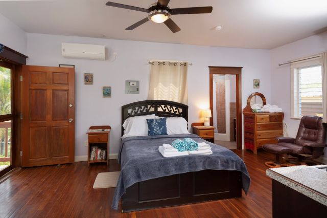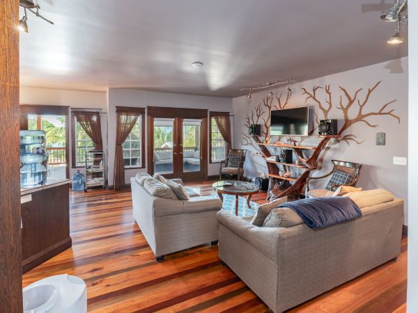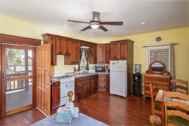 Inside, the home feels immaculate and like-new, with polished hardwood floors throughout. The open-plan kitchen, dining, and living area is spacious and fully equipped, featuring custom cabinetry handcrafted by the owner, a skilled carpenter. Tongue-and-groove ceilings and split-opening windows enhance airflow and add to the home’s elegant tropical character.