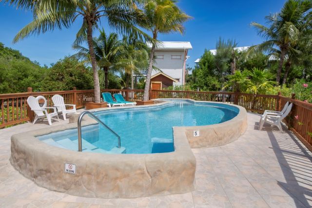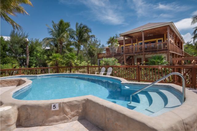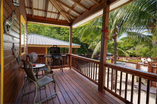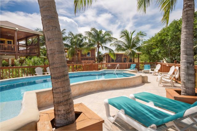 Set on an impressive 135 ft x 135 ft waterfront parcel, the property features three beautifully designed, charming, high-quality wooden constructed residences, thoughtfully positioned to blend seamlessly with the surrounding tropical landscape. At the heart of the grounds lies a uniquely designed freshwater swimming pool, playfully shaped like a manatee—a charming focal point for guests and owners alike.