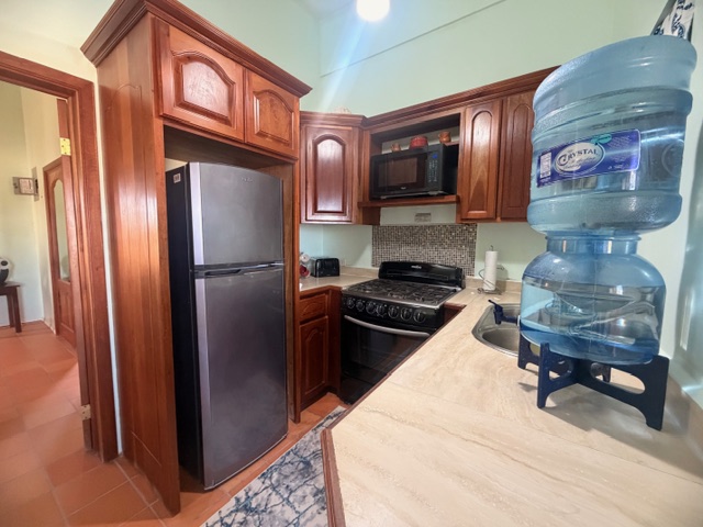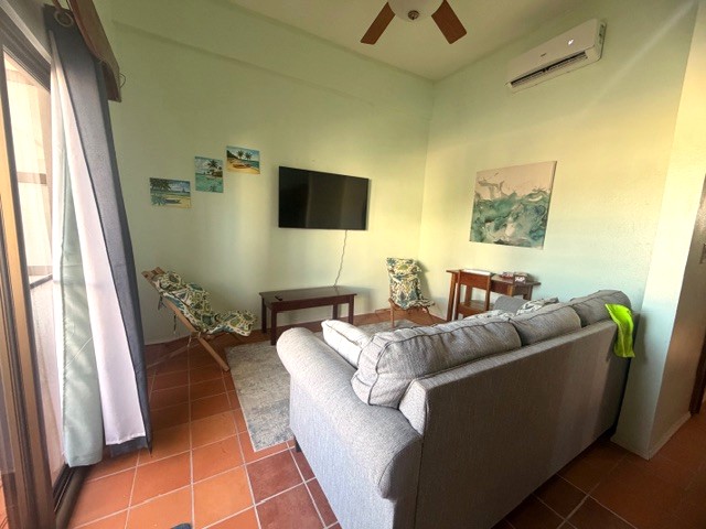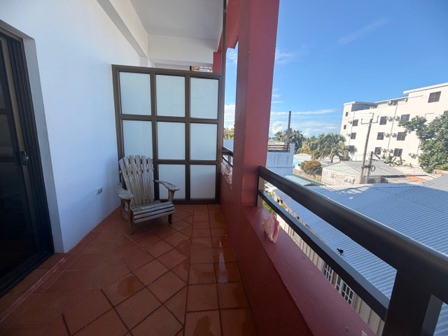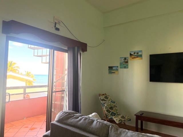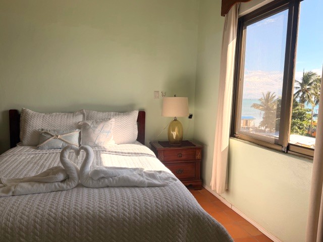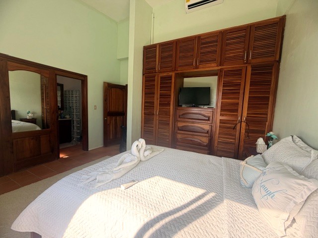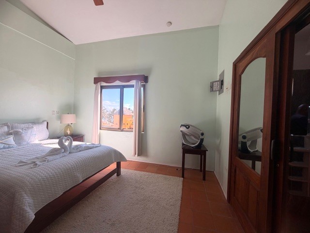 Located on the third floor, this thoughtfully designed unit features an open-concept layout, cooling tiled floors, and high ceilings throughout. The cozy living area includes a pull-out sofa—perfect for hosting additional guests—while the fully equipped kitchen showcases beautiful Belizean mahogany cabinetry. The mahogany finish continues into the spacious bedroom, which features ample built-in closets and a generous ensuite bathroom with a designated space and hookup for a washer and dryer.